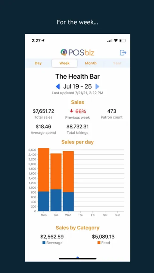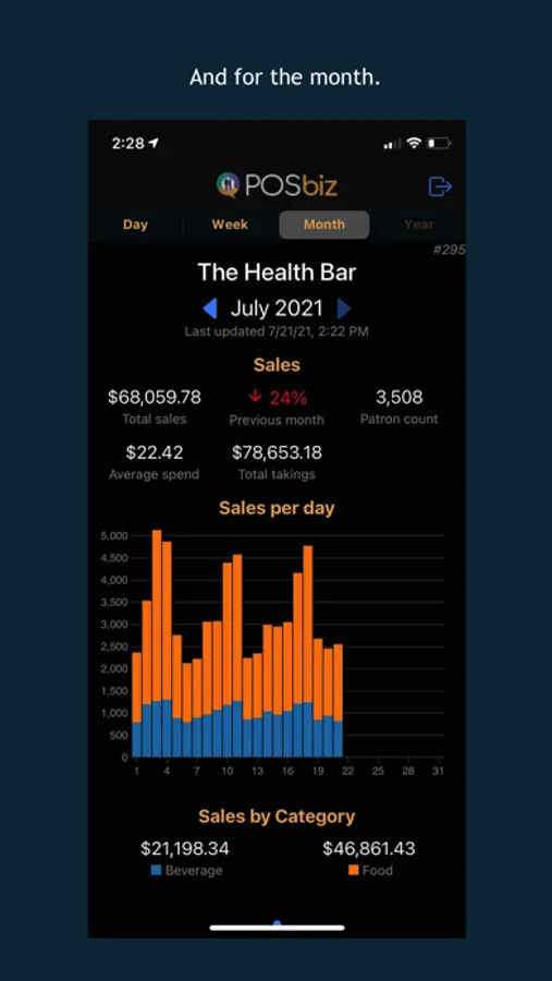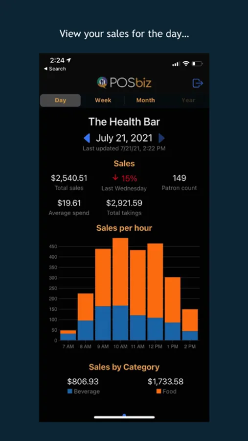 Total sales are represented graphically with category breakdown, to help identify key trends to aid with staffing and product decisions.