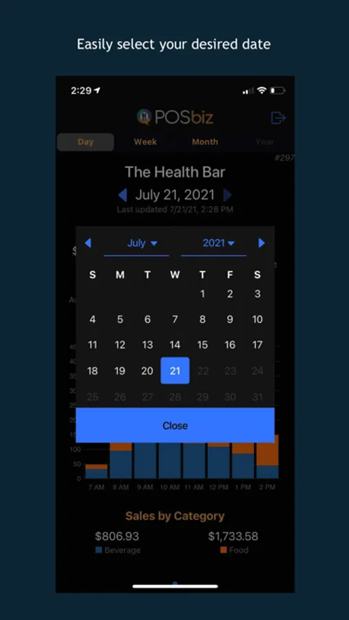 The app will show sales data in daily, weekly, and monthly views, including comparison with the previous period.