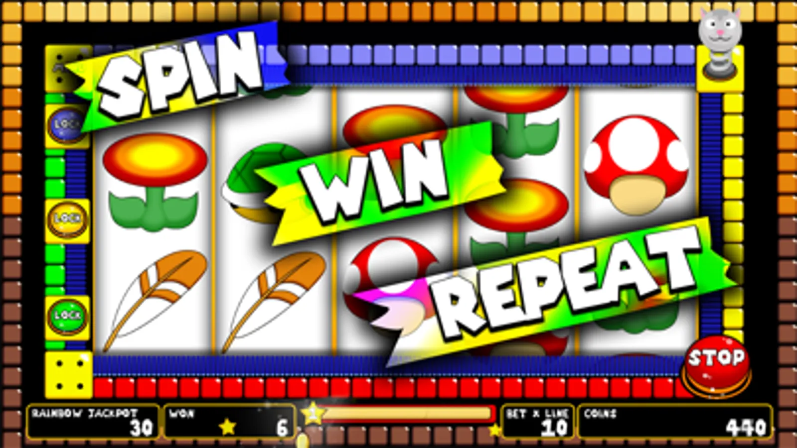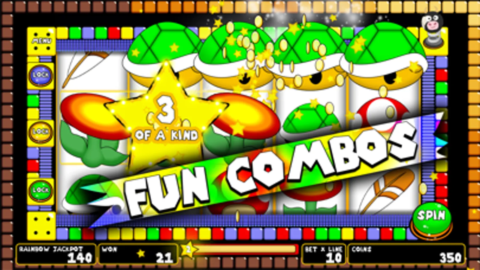 Spend sometime in this kingdom of colorful and warm retro experience playing slots. Drop in a coin (ba-ling!) and get matches to achieve combos for jackpot rewards. Stars and coins explode everywhere! Use your winnings to spin again or shop for a bobble charm.