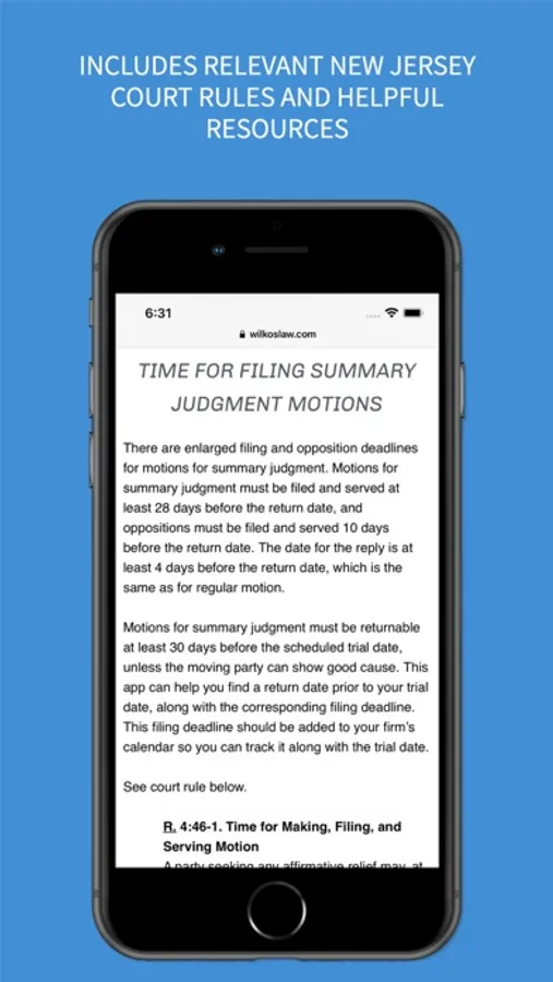 The app supports regular civil motions and motions for summary judgment. It also includes helpful information regarding various types of motions along with citations to the New Jersey Court Rules.