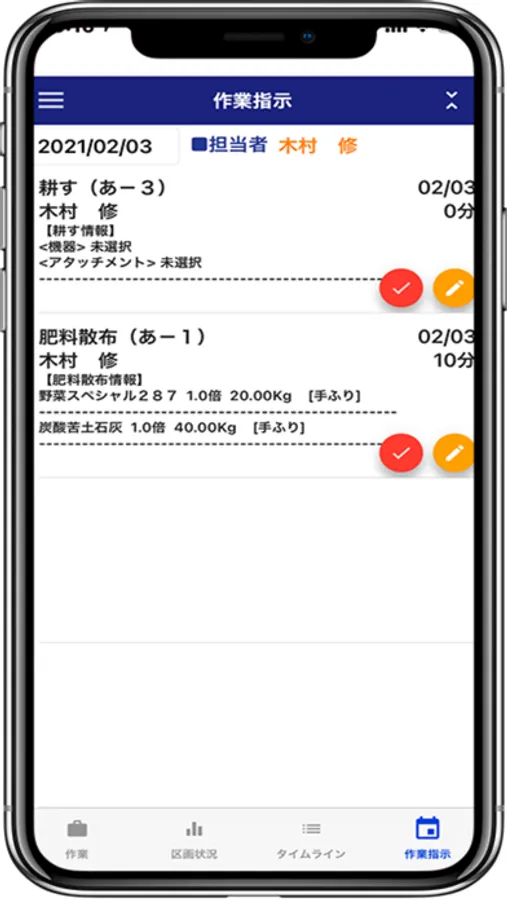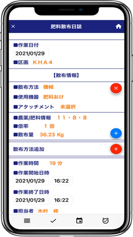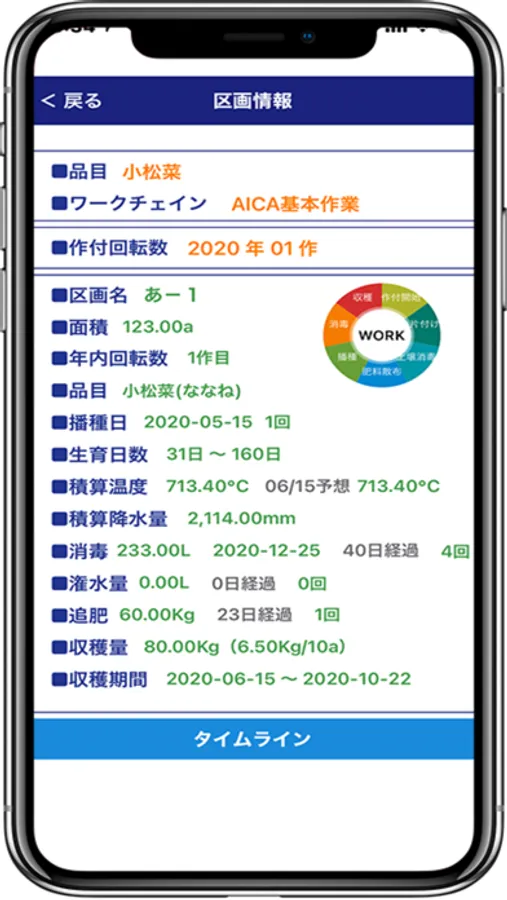 各作業の進捗、作業日、散布量、収穫量、経過日数などが確認できます。