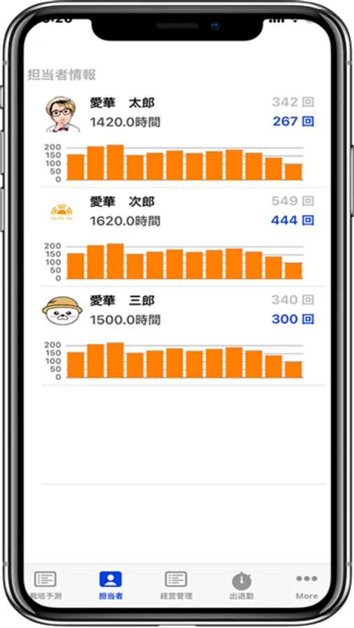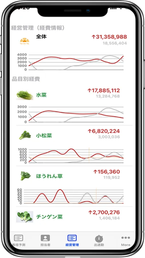 作業記録を元に、日毎、担当者毎、品目毎の収穫量実績をグラフで確認できます。