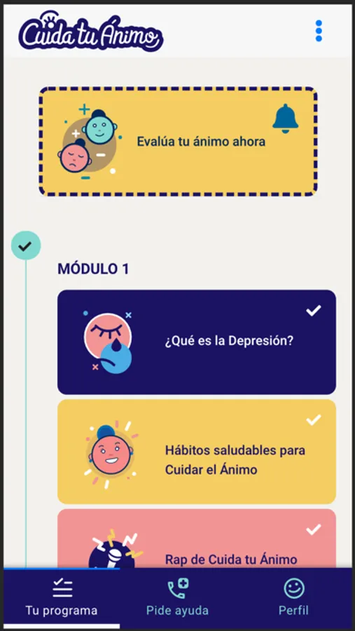 En la App Cuida tu Ánimo encontrarás información sobre salud mental, espacios para monitorear tu estado de ánimo, material audiovisual y artístico para cuidar el ánimo, programas y estrategias para solucionar los problemas y manejar las emociones y las relaciones, y actividades para identificar las personas que te pueden apoyar en momentos difíciles.
