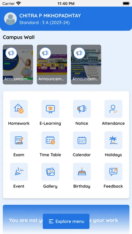 Sorath International School App offers features like Online Learning, attendance, home work, notice, announcement, gallery, events, time table, download, feedback, holiday, birthday or fees payment.