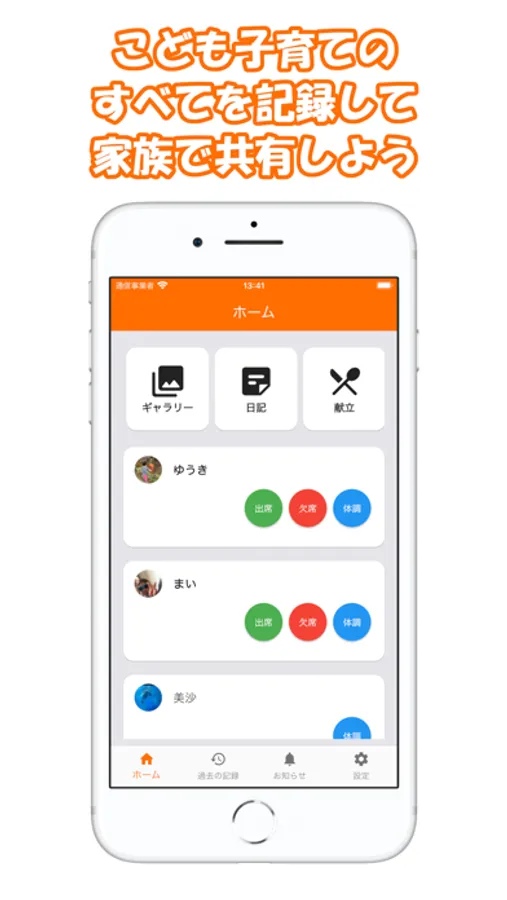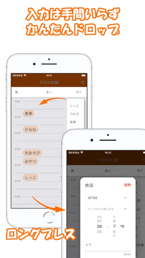 日々発生する子育ての行動やイベントを記録して、あとで閲覧して懐かしんだり、生活態様の傾向を把握するなど、使い方は様々です。