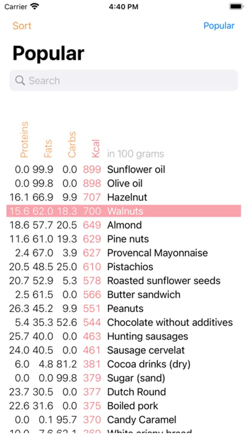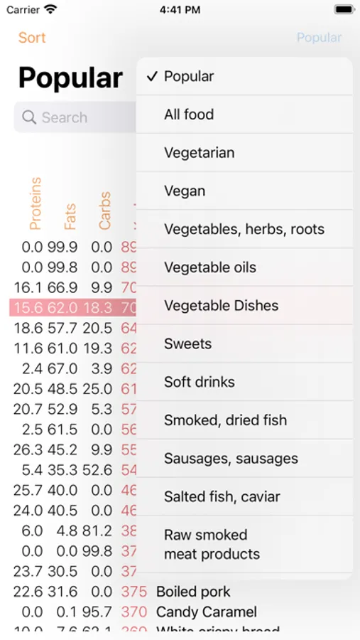 The application allows you to find out the calorie content of foods, the content of proteins, fats, carbohydrates. Sort by the desired characteristics, filter by category (for example, baked goods, vegetarian products, fruits). Find the best food for your current goals.