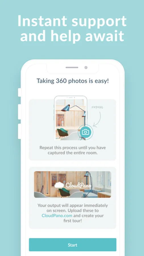 Open the app, and hold your phone vertically in front of you. Rotate around the scene, and connect the photos by following the screen prompts. When you complete your full 360º photo you can move to the next location. When your photos are created, connect them inside the virtual tour creator with a few clicks. Publish your virtual tour by sharing the URL link or use the embed code provided for an easy addition to your website.
