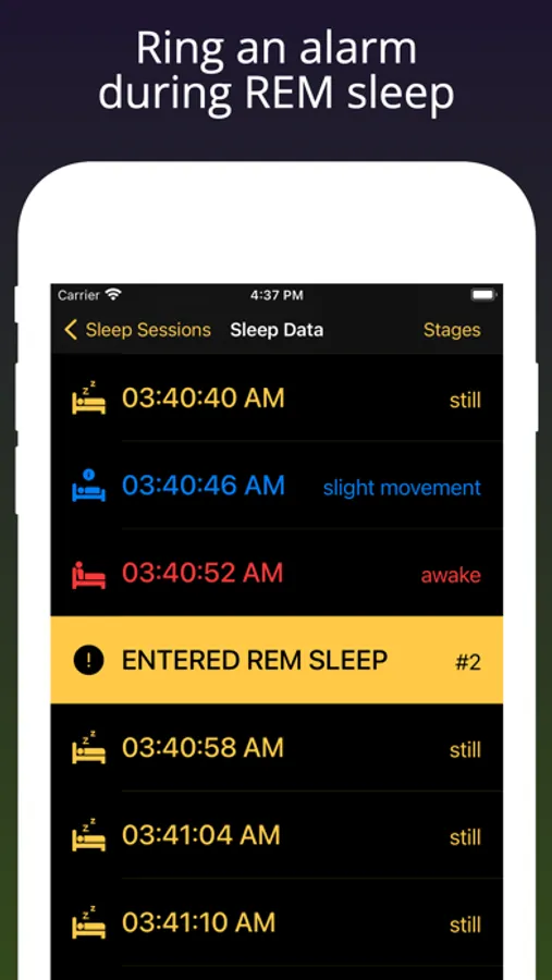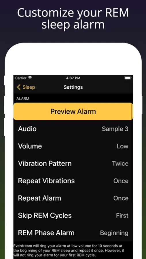 How does it work? All you have to do is start a sleep session and go to bed. Everdream will monitor your sleep, measure sleep stages, and ring an alarm during REM sleep to help you become aware that you are dreaming. Customize your alarm with your own audio, volume, vibration patterns, and repeat options.
