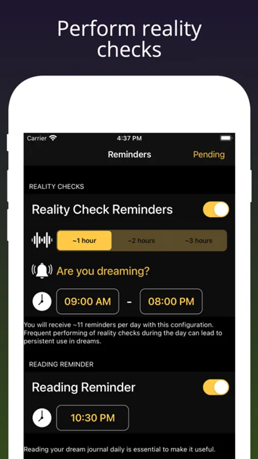 Mastering the practice of reality checks is an important step in learning how to induce lucid dreams. Everdream can remind you to perform reality checks throughout the day with custom notifications.