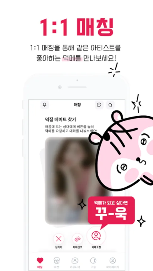 - 덕메를 만들고 싶을 때 같은 팬덤 내에서 매칭 할 수 있는 1:1 매칭