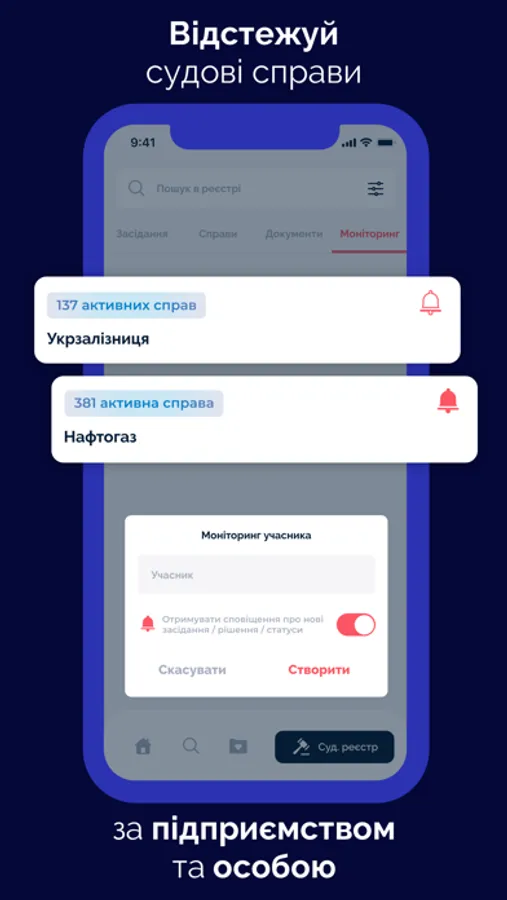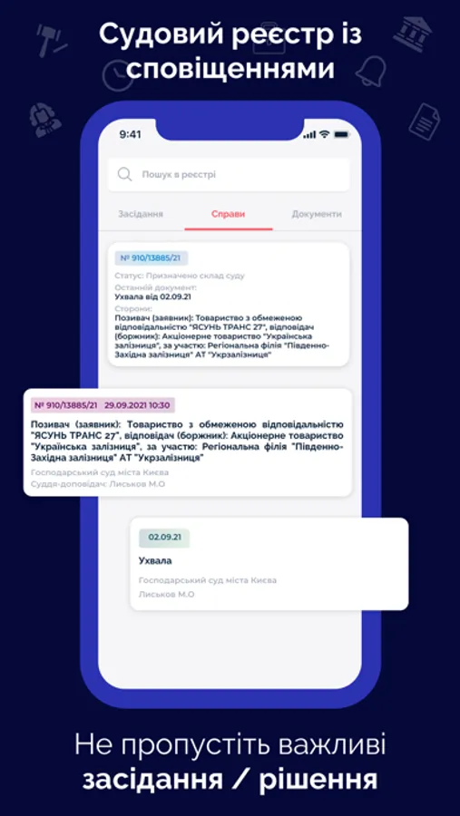 Додавайте справу для відслідковування та отримуйте сповіщення про призначення нових засідань та нові рішення по справі.