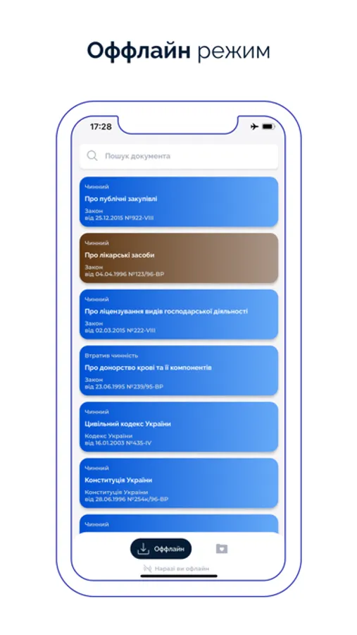 ⁃ оффлайн режим. Будьте певні, що навіть коли мобільний зв‘язок підводить, Leges не підведе і всі небхідні закони будуть під рукою;