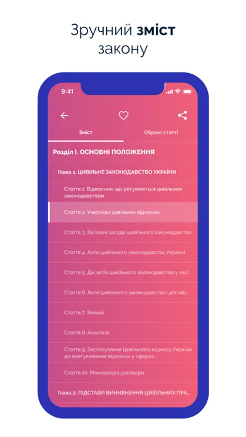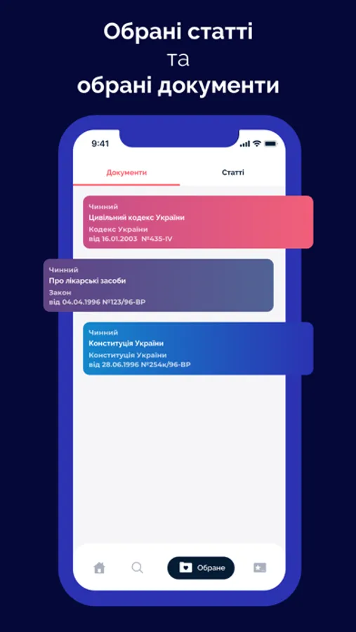 ⁃ можливість додати закони або навіть окремі статті до обраного, щоб найважливіше завжди було на відстані одного свайпу;