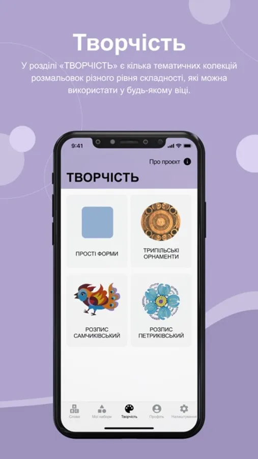 У розділі «Творчість» усі охочі (дорослі і діти) можуть розмалювати композиції різного рівня складності, розвивати творчі здібності та креативне мислення. Завдяки розвитку моторики можна впливати на розвиток мовлення. Частину композицій для розмальовок створено для знайомства з культурною спадщиною Україні та орнаментами різних часів і народів. Розмальовку як результат творчості можна зберегти на власний пристрій або поділитися нею через програми, які є на пристрої користувача.