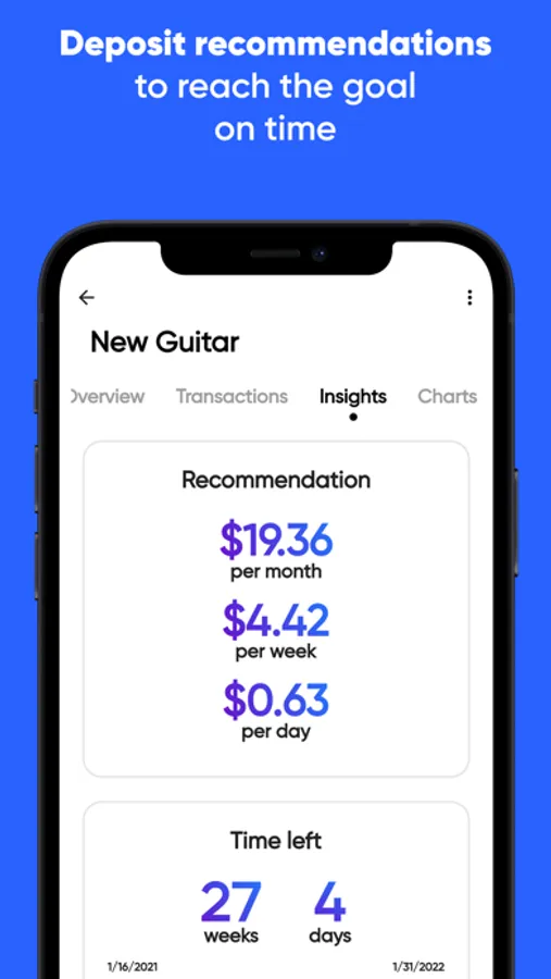 - Recommendations: Set a target deadline date and visualize recommendations for monthly, weekly or daily deposit amounts to reach the target on time.