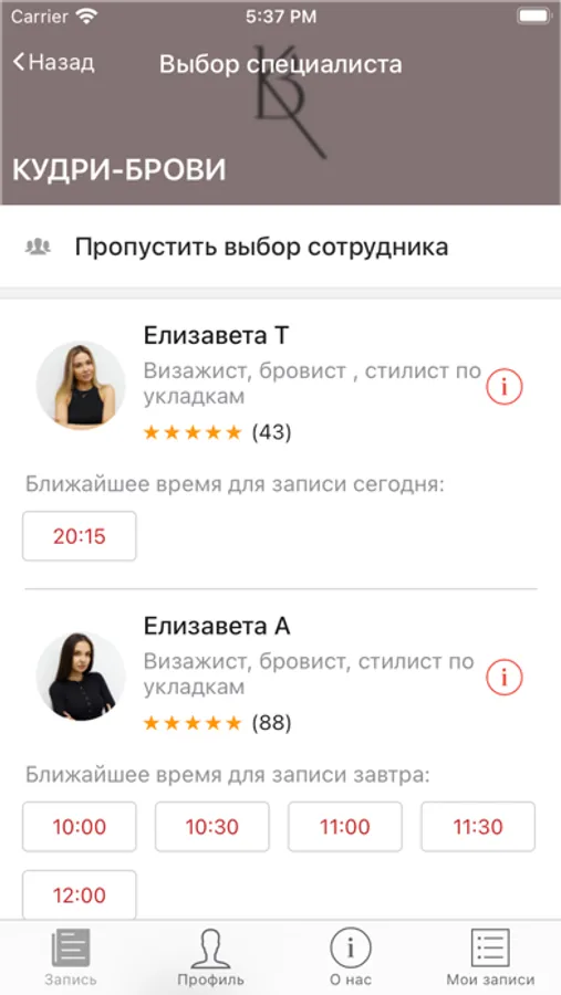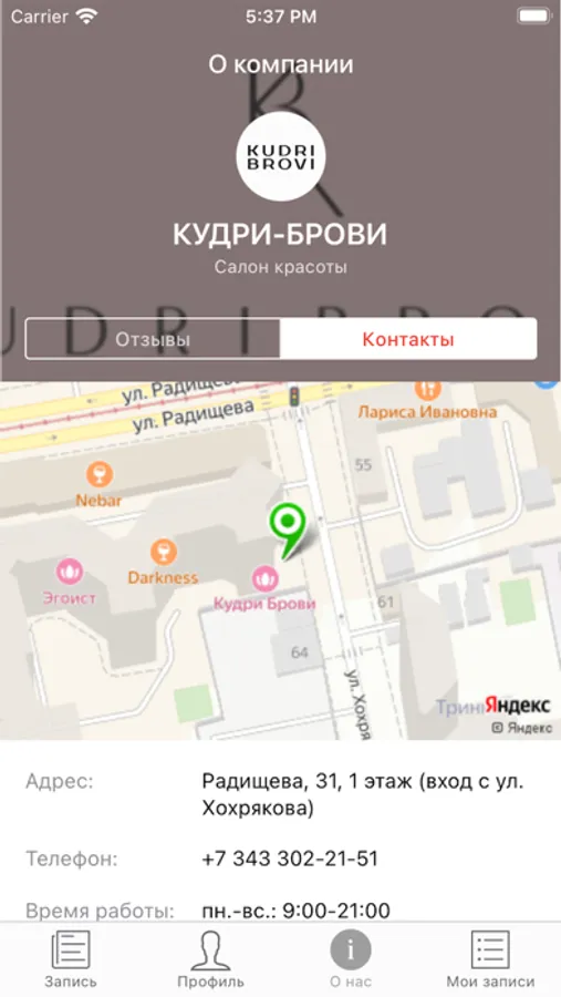 Приложение для онлайн-записи в студию красоты KUDRI BROVI г. Екатеринбург