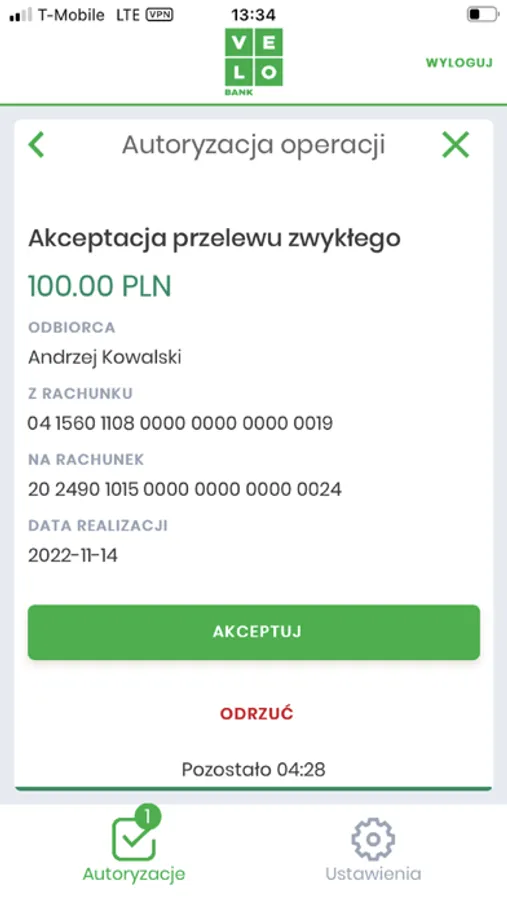 Podczas kolejnego logowania do bankowości VeloBiznes podaj login i hasło oraz zaakceptuj logowanie w aplikacji mobilnej VeloToken kodem PIN. O logowaniu i akceptacji dyspozycji powiadomi Cię komunikat PUSH.