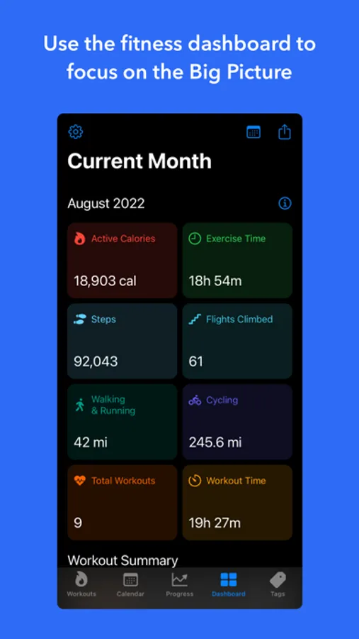 - Fitness dashboard to help you focus on the Big Picture