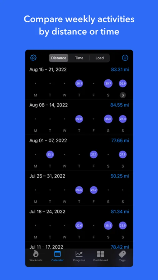 - Training log lets you compare weekly activities relative to each other by distance, time or training load