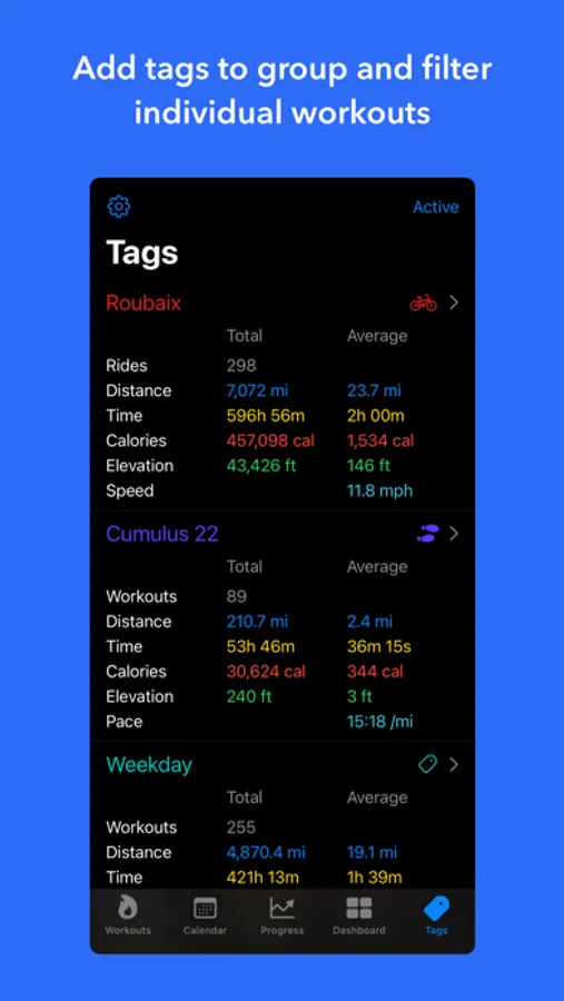 - Add tags to keep track of your bike, shoes, trails, long runs and more