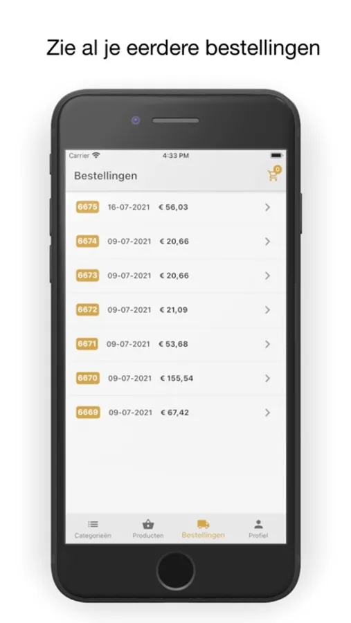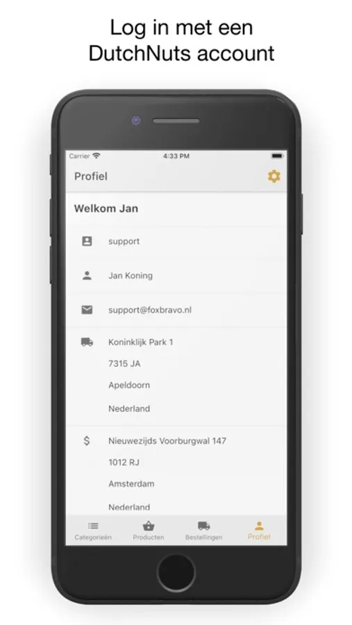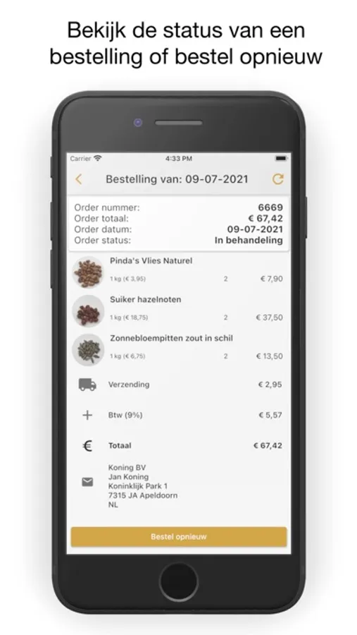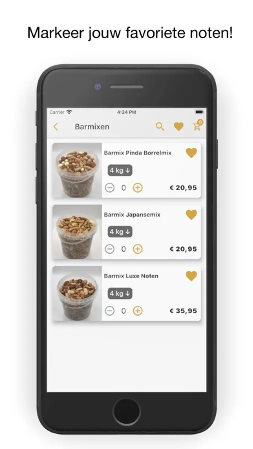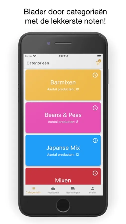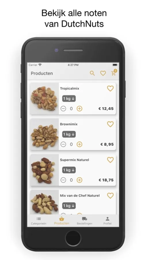 Met de DutchNuts app kun je eenvoudig en snel alle producten met bijbehorende prijzen bekijken, deze opslaan in een favorietenlijst of direct een bestelling maken.