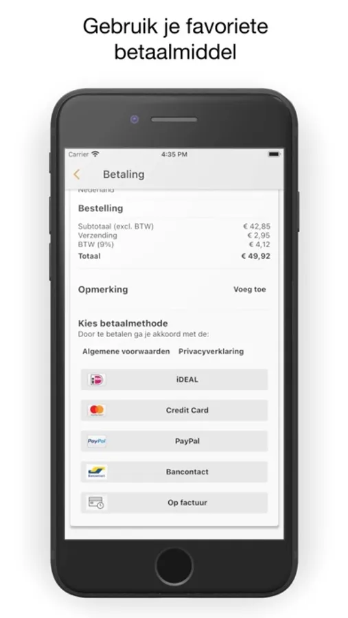 -Direct betalen met IDEAL of Credit Card, PayPal of Bancontact -Bedrijven met bedrijfsaccount kunnen bestellen op factuur