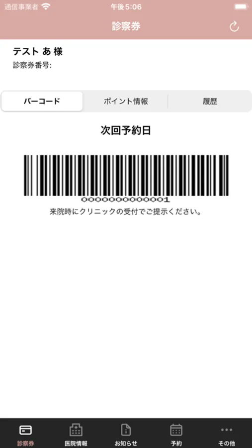 バーコードをかざすだけで受付出来るチェックイン機能、次回ご予約日時表示など、カードレスな診察券としてご活用頂けます。