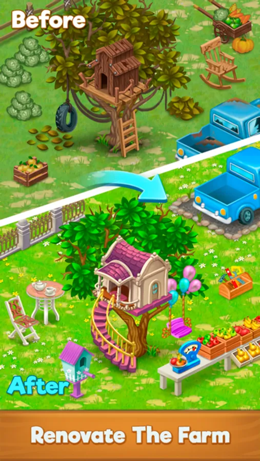 Discover the wonderful farm world. Grow and harvest crops in the garden to feed your farm pets and receive goods. Make your design decisions, to create your own farm decor. Relax and enjoy the view of the farm you design and if you want, visit your friends, to share true gardeners’ experience. Earn daily rewards or take part in special events - there is a gameplay for everyone. Hurry up, to enjoy this free to play world of entertainment!