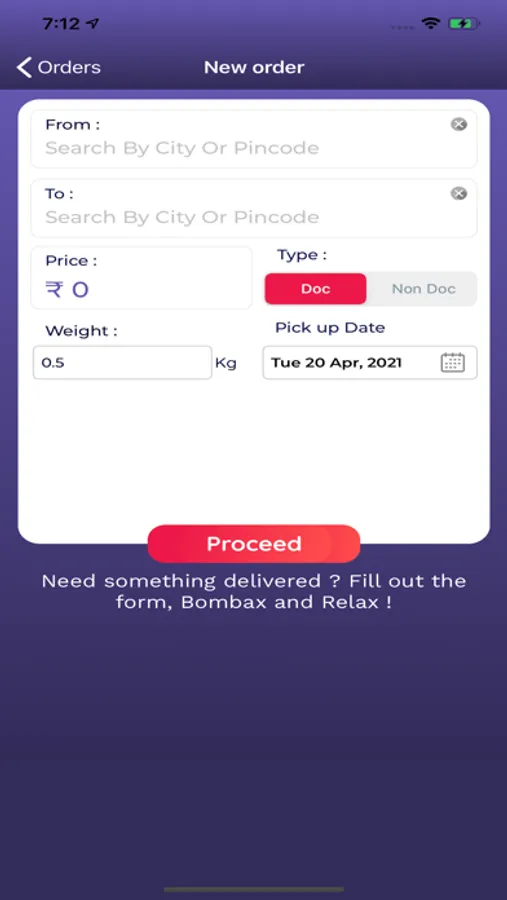 For Local Deliveries – within the city: Just enter the Pick-Up and Drop addresses and let the App calculates the Price based on distance and service (Same Day or Next Business Day options are available).