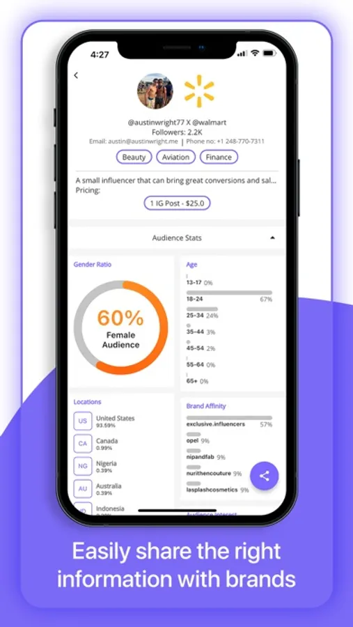 Create your customized sharable influencer profile link that includes important information such as your Bio, gigs and prices, media kit and analytics, and reviews of your profile. Share this information to brands, and put it in your BIO on Instagram so brands can discover you more easily.
