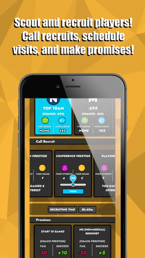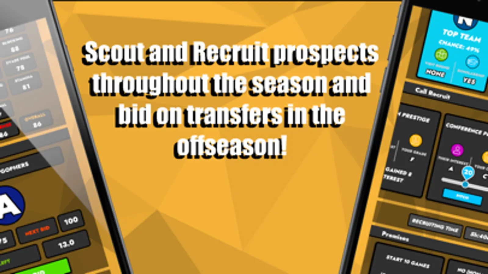 College Basketball: Dynasty Sim puts you at the helm of a college basketball team. Do you have what it takes to build your team from the ground up, from a cupcake to a perennial powerhouse? Choose a College Basketball team, customize and upgrade your coach, customize your non-conference games, adjust your gameplan, scout and recruit new players, and bid on transfers to see if you have what it takes to win Conference Championships and the Big Tournament.