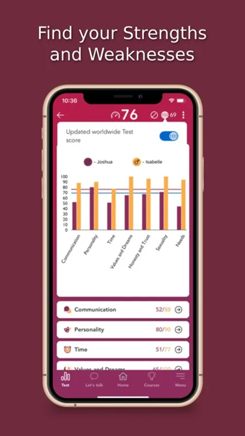 → You can do the love test as a single or with your partner. In order to see the results of the partner, there is the function to link his / her profile with the partner profile. Now you can compare your results and see your strengths and weaknesses in the relationship at a glance.