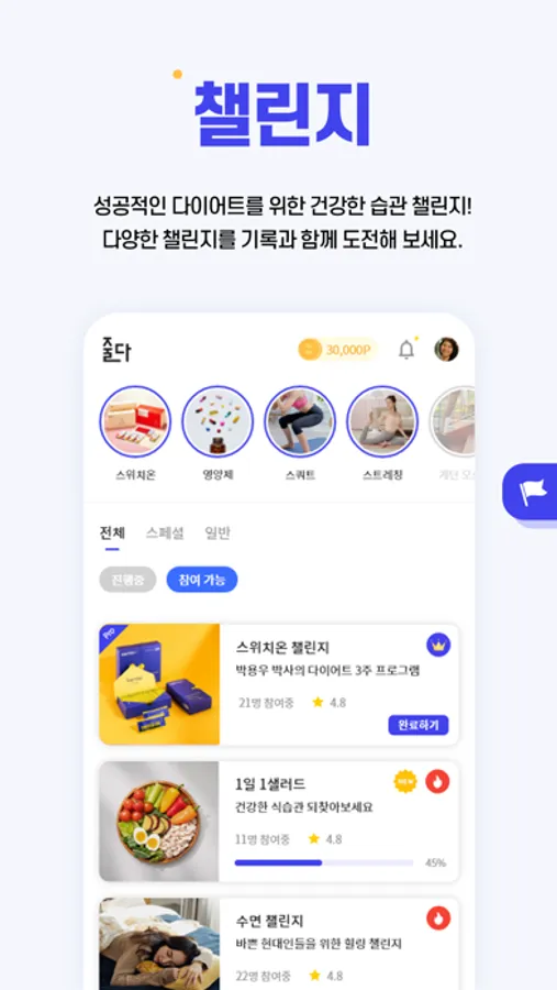 꿈을 이루는 건강한 다이어트 습관 챌린지! 간단한 스트레칭 챌린지부터 고강도 인터벌 운동 챌린지까지 기록과 함께 도전해 보세요.
