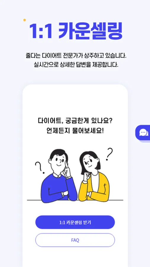 다이어트 할 때 궁금한 점도 이제는 줄다에서 물어보세요! 다이어트 전문가가 개개인에 맞는 1:1맞춤 카운셀링을 실시간으로 제공해드립니다(프리미엄 멤버십 이용 시 상담 시간 내 무제한 이용 가능).