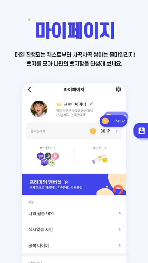 퀘스트를 통해 줄마일리지를 얻어보세요. 줄다와 같이 다이어트 하면 마일리지를 모으고 쌓여가는 마일리지를 보며 성취감을 느낄 수 있습니다.