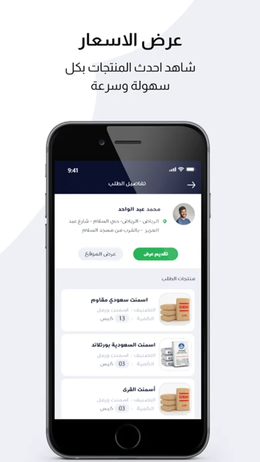 تطبيق بناء لعرض جميع مواد البناء بطريقة سلسة وسهلة يمكنك طلب جميع مواد البناء بكل سهولة من خلال التطبيق , يحتوي التطبيق على مجموعة من الموردين لتقديم عروض اسعار على طلبات الشراء ,يمكنك اختيار العرض المناسب لك ويمكنك التواصل مع المورد بكل سهولة , ستصلك اشعارات فورية عند استقبال اي عرض على طلبكيوجد ايضا منطقة خاصة لتسجيل الموردين لاستقبال طلبات المستخدمين وتقديم عروض على الطلبات من خلال التطبيق , ايضا يصلك كمورد اشعار فوري عند وجود طلب جديد ضمن اهتماماتك