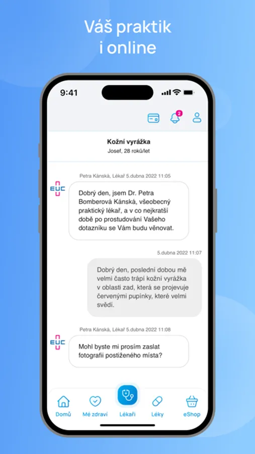 Běžné problémy vyřešíte bez nutnosti návštěvy ordinace. Služba je dostupná pro pacienty registrované u našich praktických lékařů, je zdarma a postupně ji rozšiřujeme do dalších EUC Klinik.