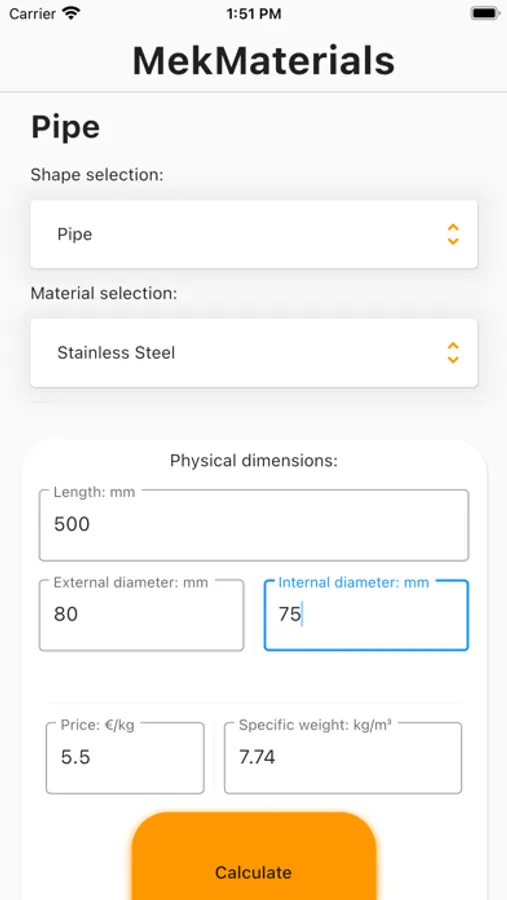 Calculator for physical values of bar materials / metals used in mechanical production.