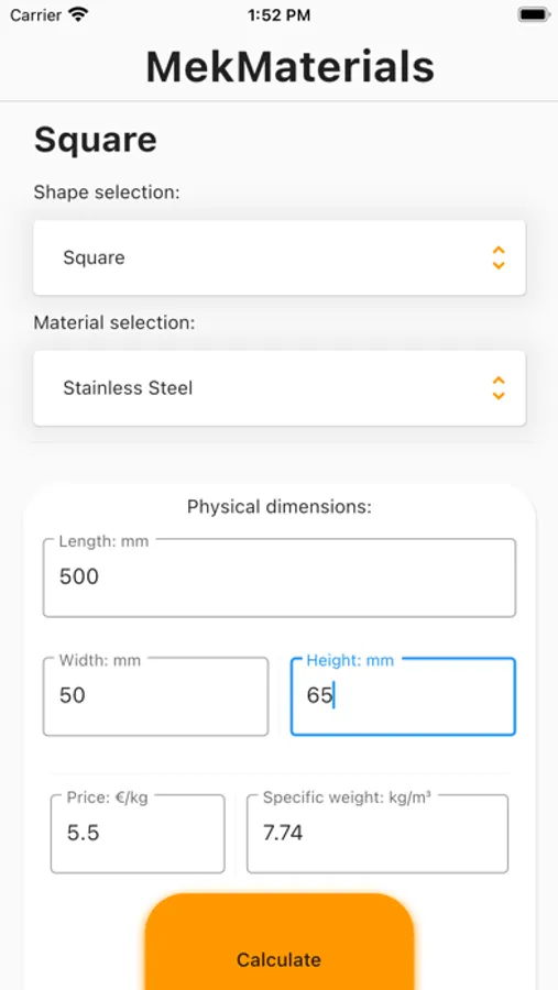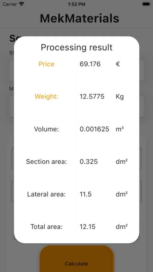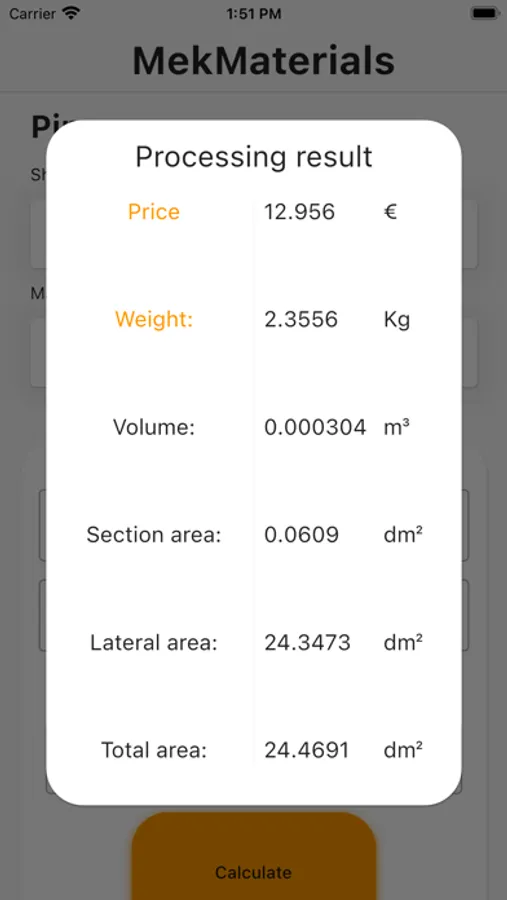 Select the type of material, define the dimensions: the result of the calculations is the volume, the area all surfaces and the price of the material.