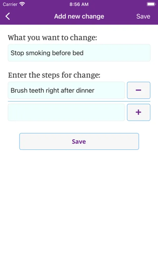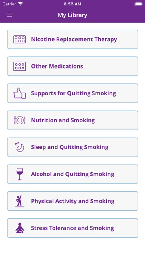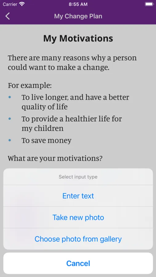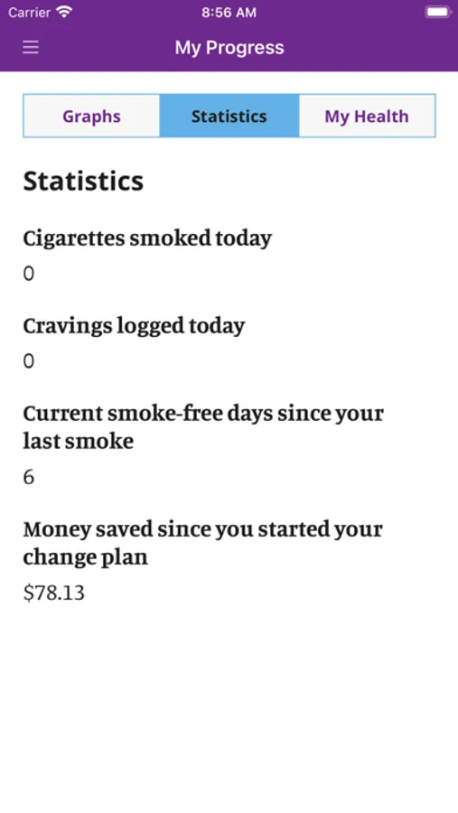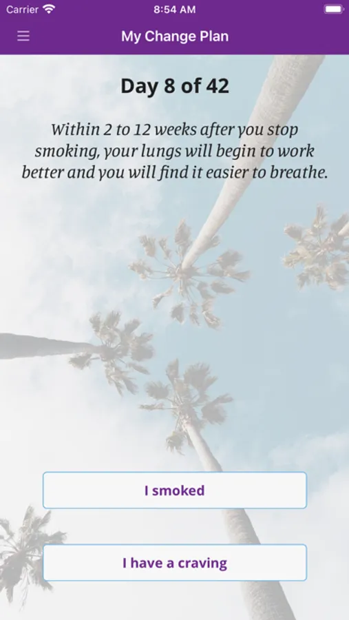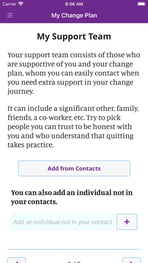 In the app you can create a personalized change plan, including your triggers, coping mechanisms, and your motivations for quitting or reducing smoking. You can also identify people who you can reach out to for support, and create a custom support team within the app. With the information you provide, My Change Plan tracks your progress with easy-to-use graphs and statistics. You can choose your end goals, including a quit date or a date to reduce smoking by, so that your Change Plan is in your hands!