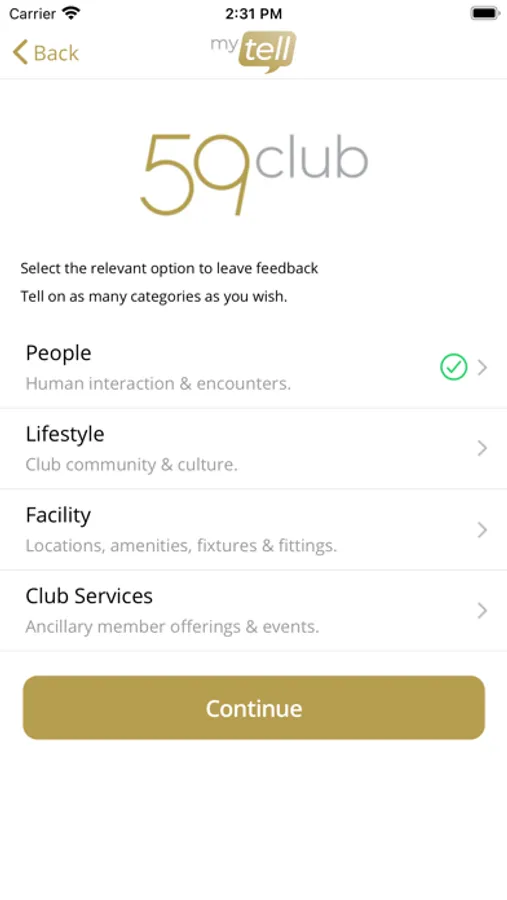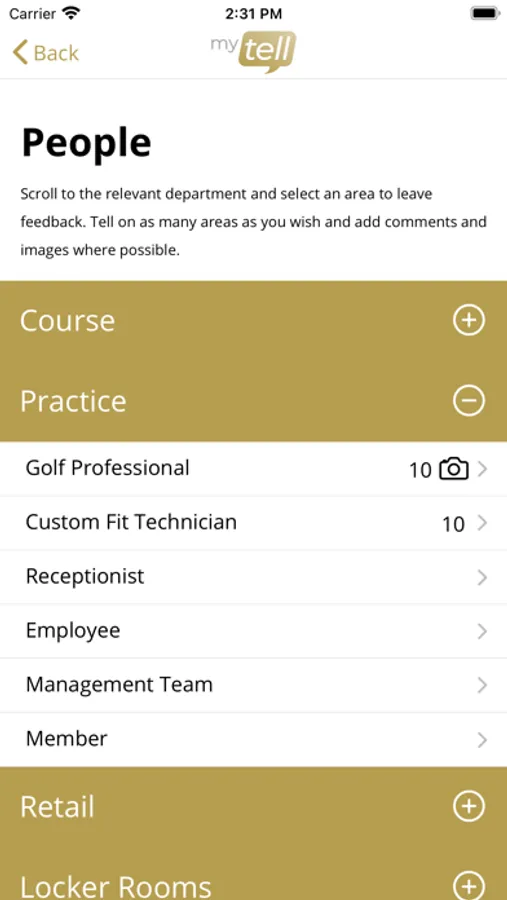 mytell allows members to post feedback direct to the relevant department at their club on numerous elements of the member experience, including People, Facility, Lifestyle, and Club Services