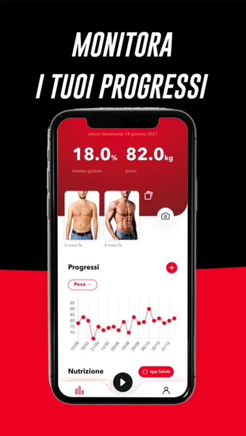 Avrai sempre sotto controllo la tua attività fisica: potrai visualizzare quali esercizi sono previsti nel tuo piano di allenamento, i tuoi progressi e come cambia il tuo fisico nel corso del tempo.