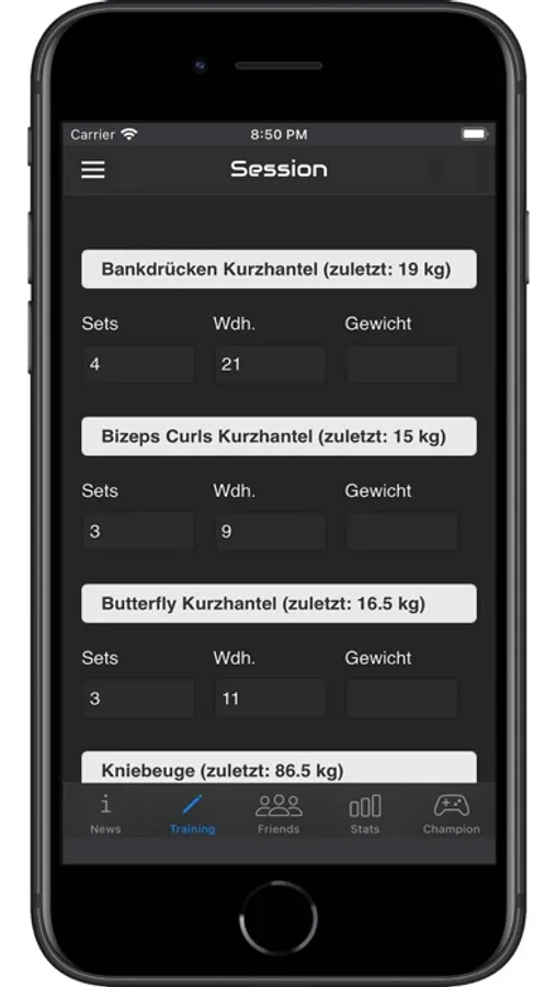Documenting your current training session is quick and easy. Fill in the exercises you've done all at once or for each exercise individually.