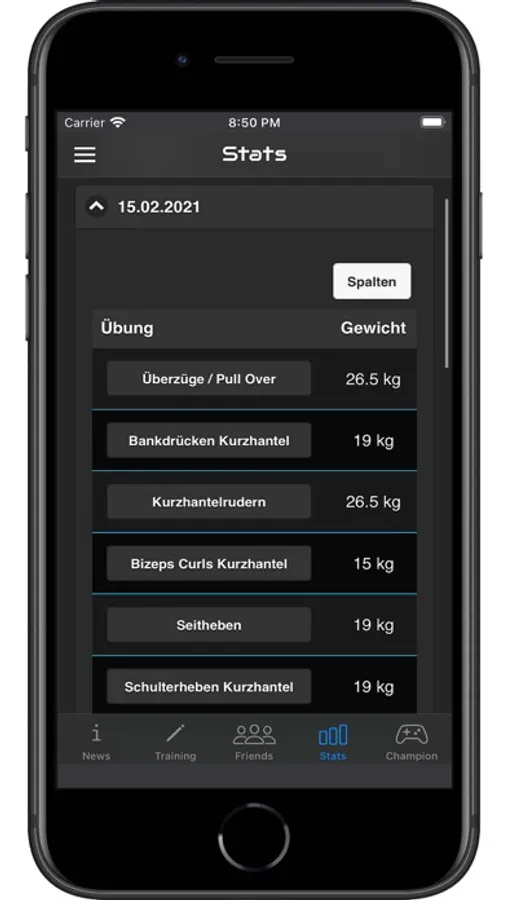 The statistics show information about your training progress. Diagrams reveal which exercise you are progressing in and in which you have currently reached a plateau. Improving your workout plan will be easier than ever.