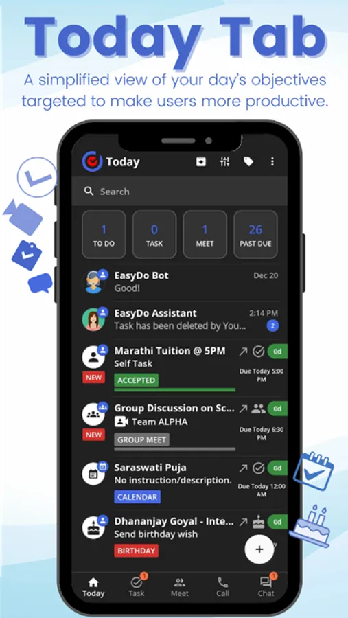 - Today Tab: A completely new approach to effectively handle and complete your daily tasks in the most intuitive and effective way. Today tab, where your Schedules are automatically listed with your to-do’s, assigned tasks, virtual & location meets, calendar events, birthdays, self Notes, chats, etc. for the day all under one tab. A simplified view of your day’s objectives targeted to make users more productive.