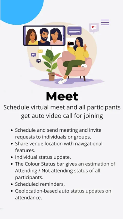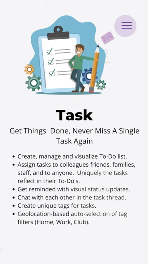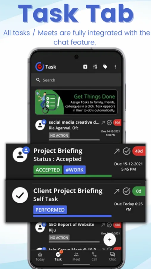 - Assign Tasks: Assign Tasks to Friends/family/colleagues and the same automatically appear in their respective to-do's. Users can create to-do's. All tasks / Meets are fully integrated with the chat feature, where uniquely you can chat with each other within the task thread and complete the task. A never seen before - Feature