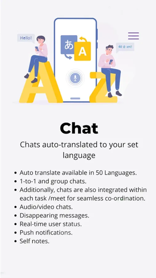 - Auto-Translate: One chat 50 Languages. See chats in your selected language.
