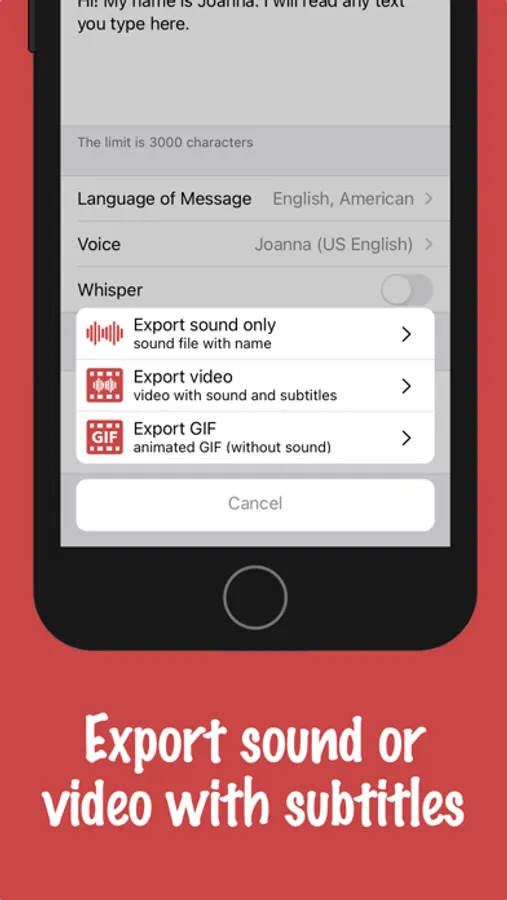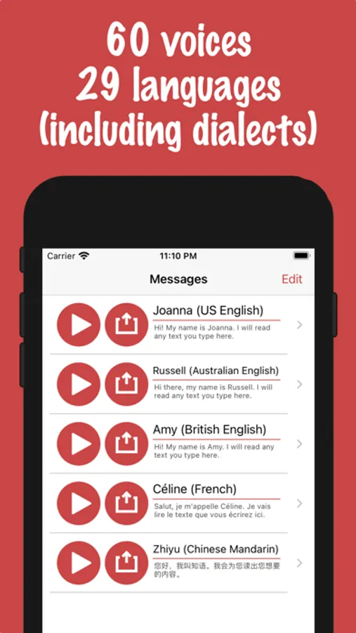 Type in the text and the application will pronounce or whisper it in any of 60 voices in 29 languages (including dialects) with the appropriate accent!