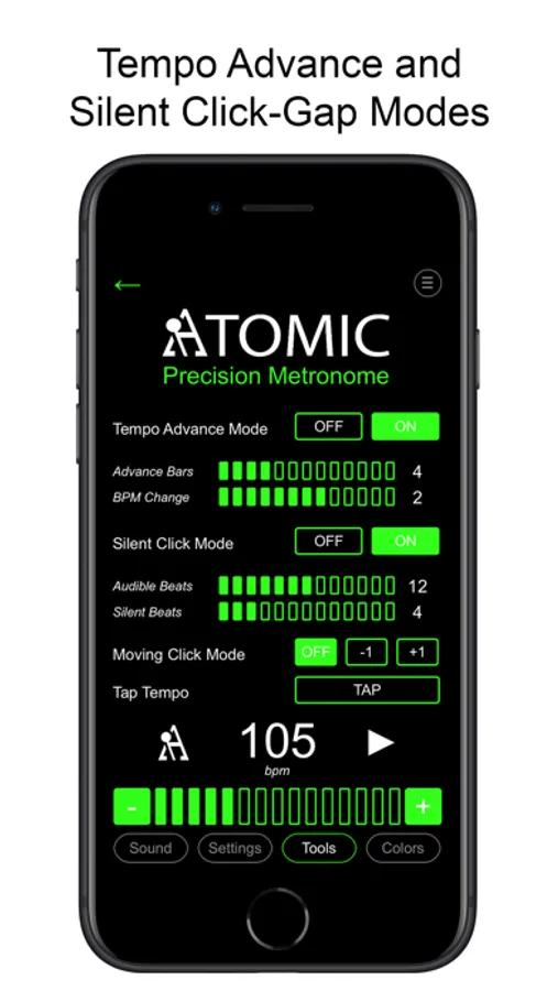 You’ll most likely want to go straight to the Colors tab and set the Atomic display to your personal color choice. There are also many ways to adjust the sound of Atomic to suit your preference and practice scenario.