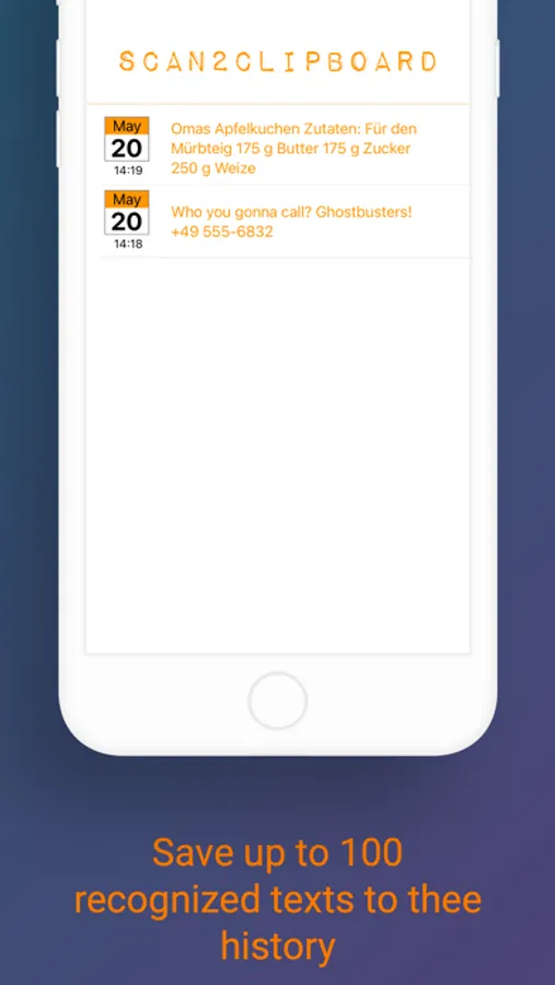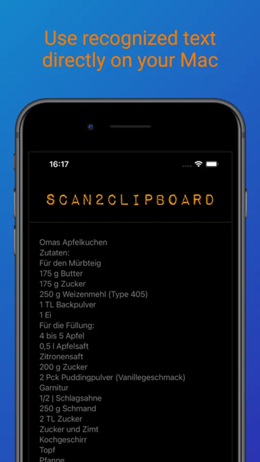 Scan2Clipboard makes it easy to scan information, convert it to text and copy it to the clipboard! With one click, the text can be pasted and further edited on all your devices logged in under the same iCloud account (iPhone, iPad and Mac).
